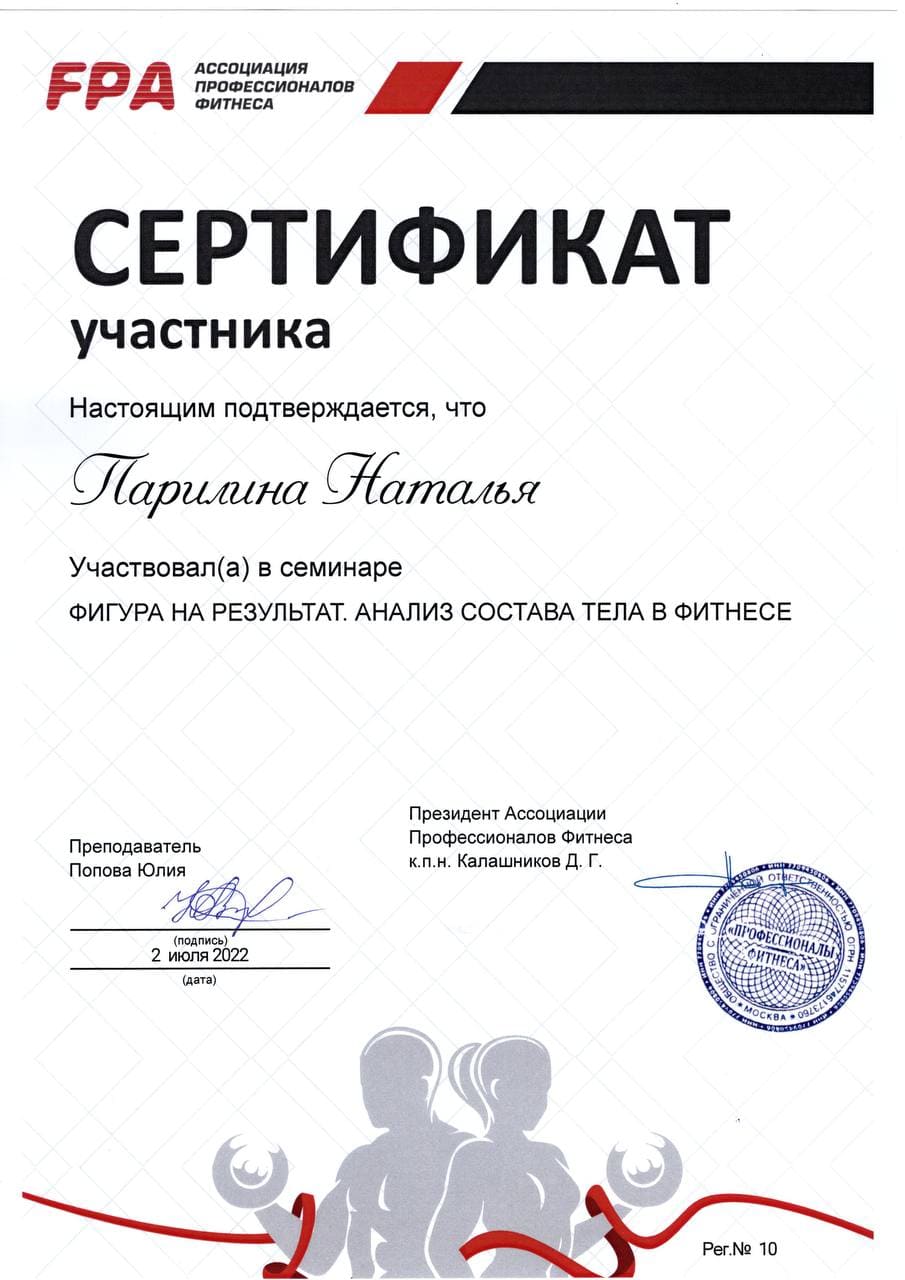 2022 – Ассоциация профессионалов фитнеса/ FPA. Сертификат участника «Фигура на результат. Анализ состава тела в фитнесе»