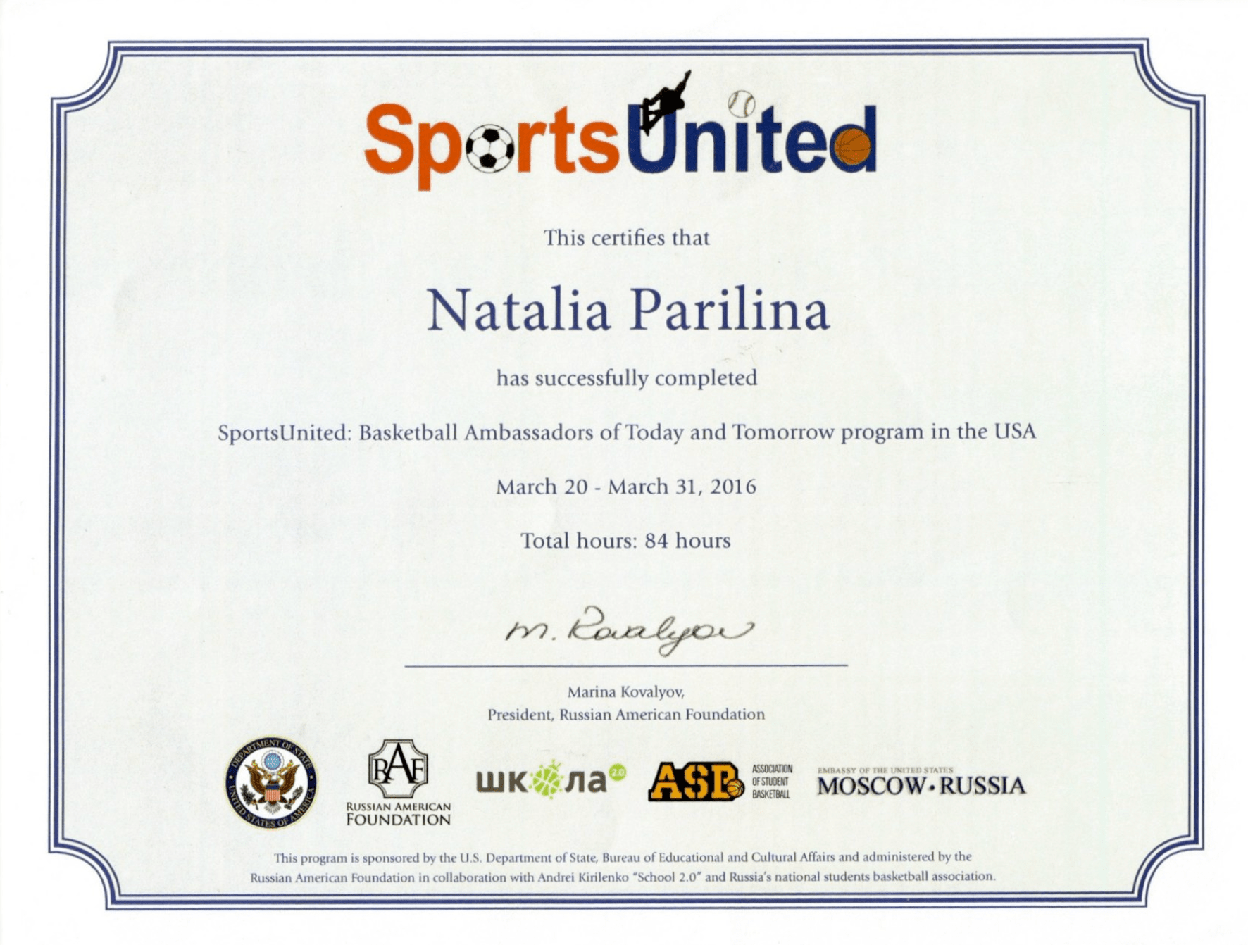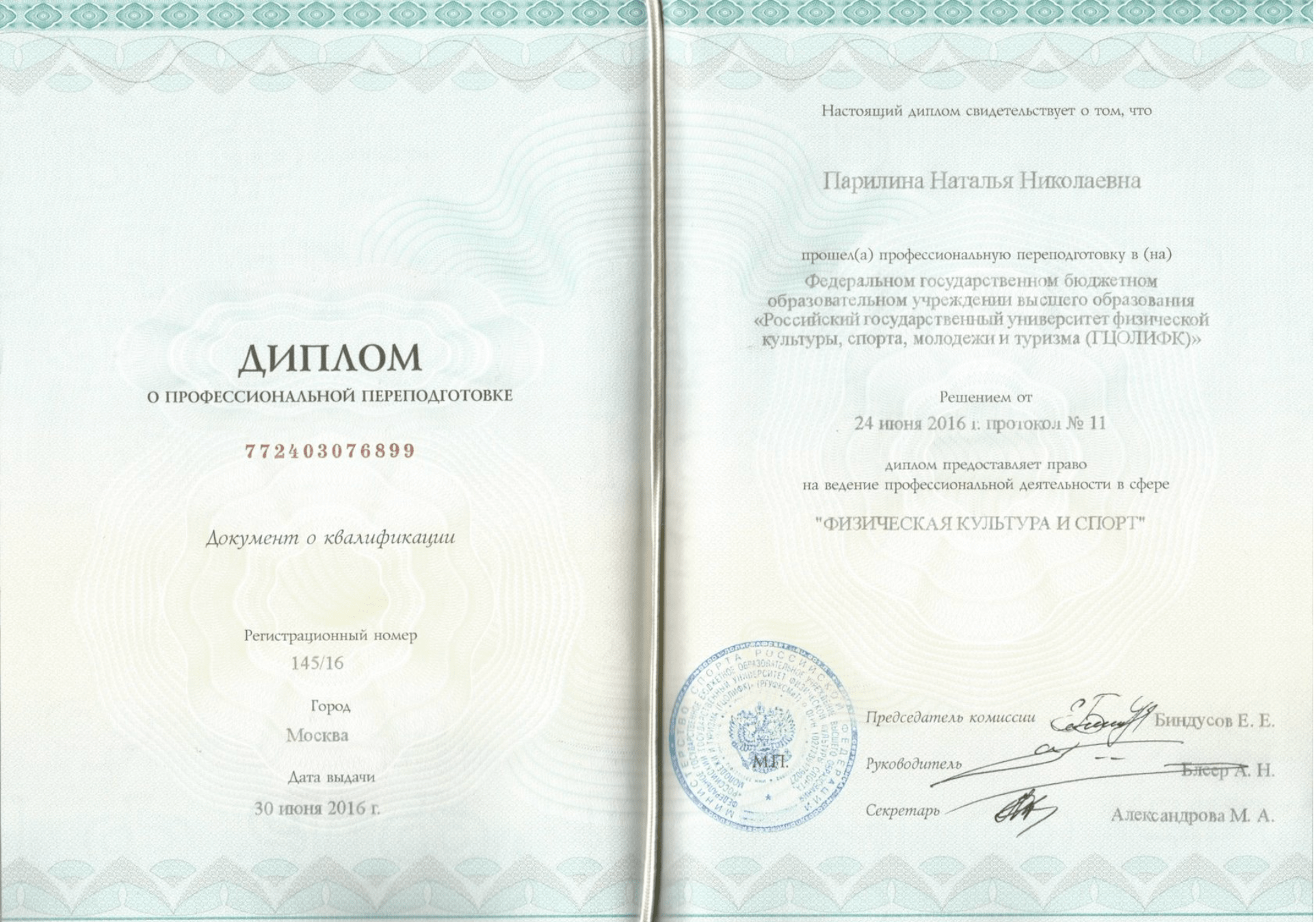 2014-2016 РГУФКСМиТ, проф.переподготовка, кафедра баскетбола, тренер по выбранному виду спорта