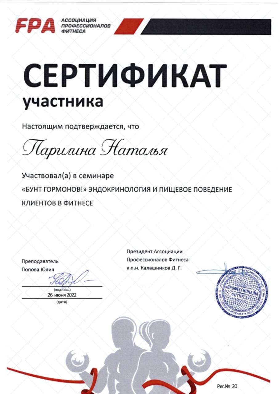 2022 – Ассоциация профессионалов фитнеса/ FPA. Сертификат участника «БУНТ ГОРМОНОВ! Эндокринология и пищевое поведение клиентов в фитнесе»