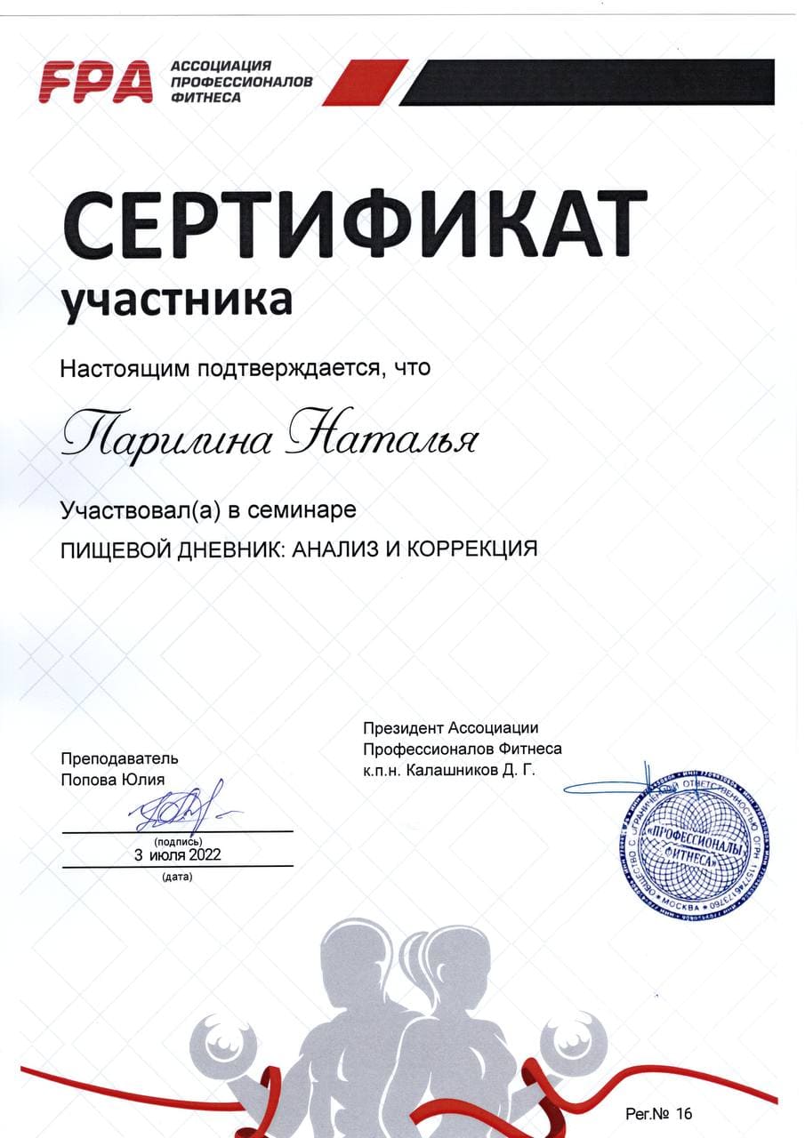 2022 – Ассоциация профессионалов фитнеса/ FPA. Сертификат участника «Пищевой дневник: анализ и коррекция».