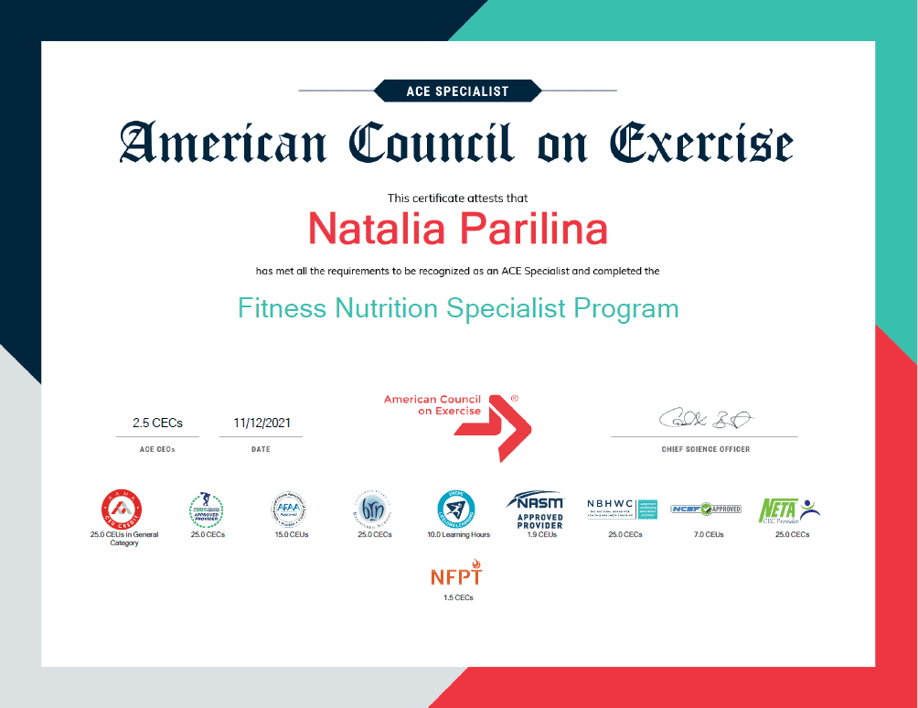 2021 – American Council on Exercise (ACE Fitness), программа Sports and Fitness Nutrition Specialist